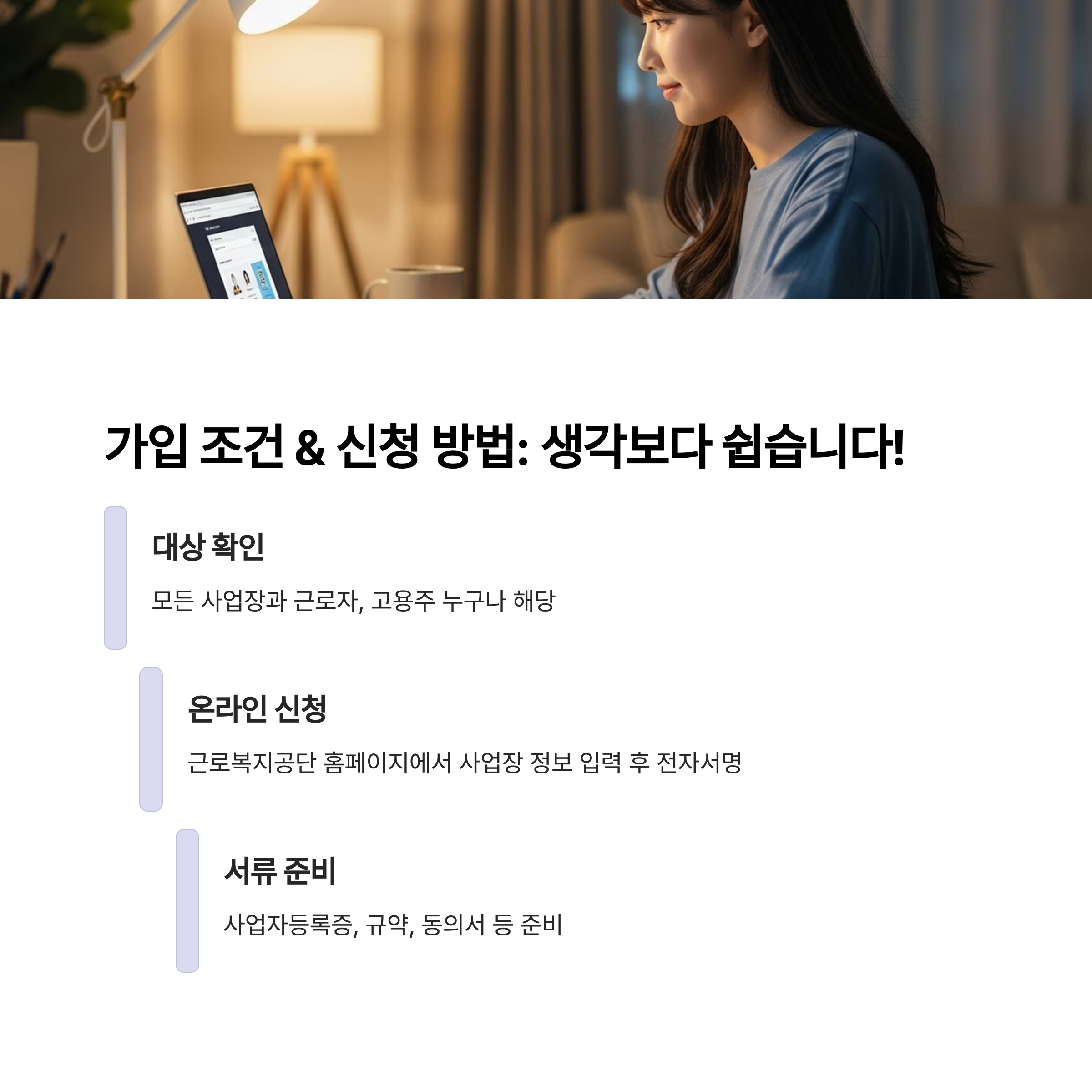 신청 방법은 매우 간단합니다. 사업주는 근로복지공단 홈페이지(또는 지사 방문), 근로자는 사업주 승인 후 공동 신청이 기본입니다. 준비서류도 간소화되어, 기본 신분증과 사업자등록증, 고용보험 가입 확인서 정도면 충분합니다.