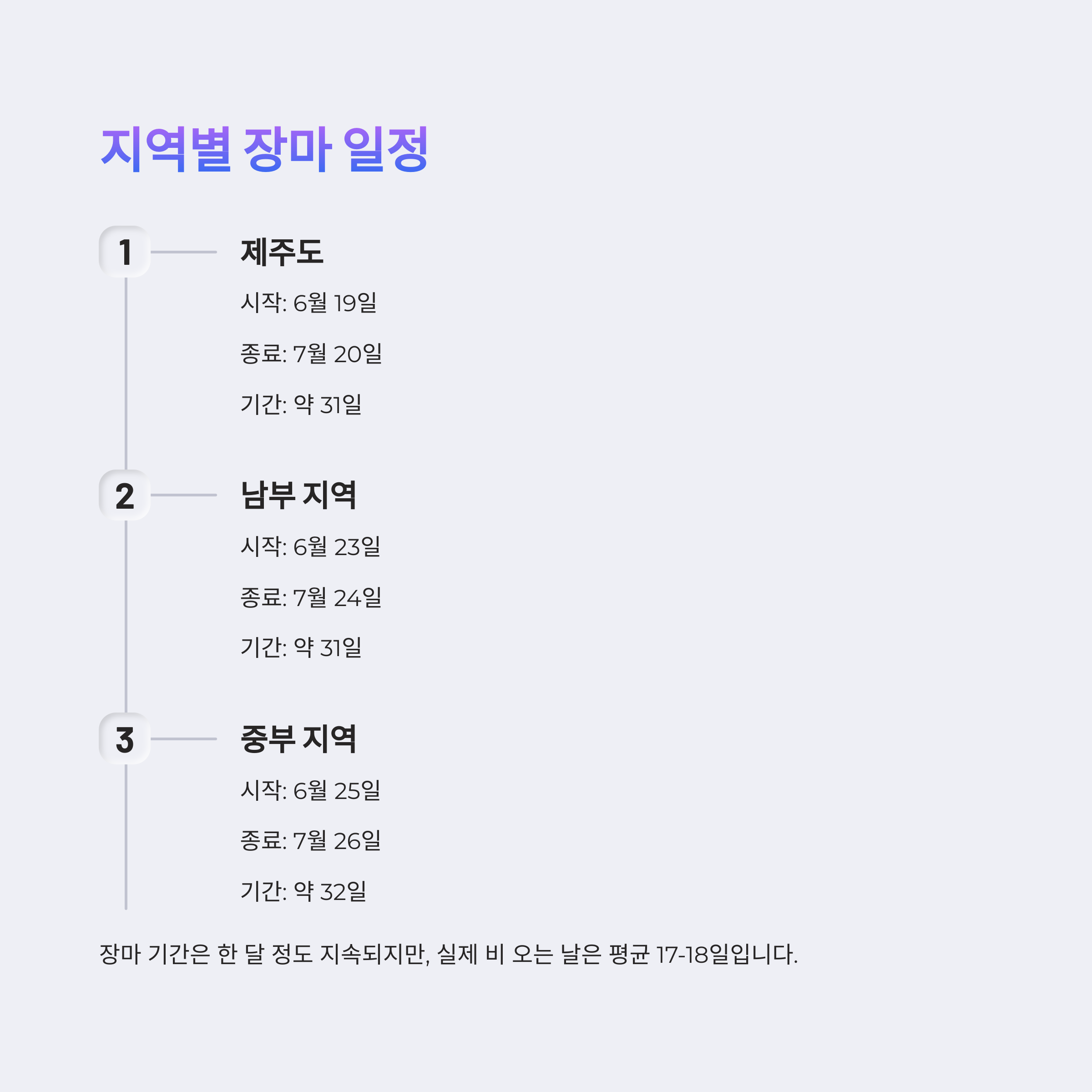 매년 조금씩 차이는 있지만, 장마철은 6월 하순부터 7월 하순까지 약 한 달간 이어진다고 기억하면 됩니다!