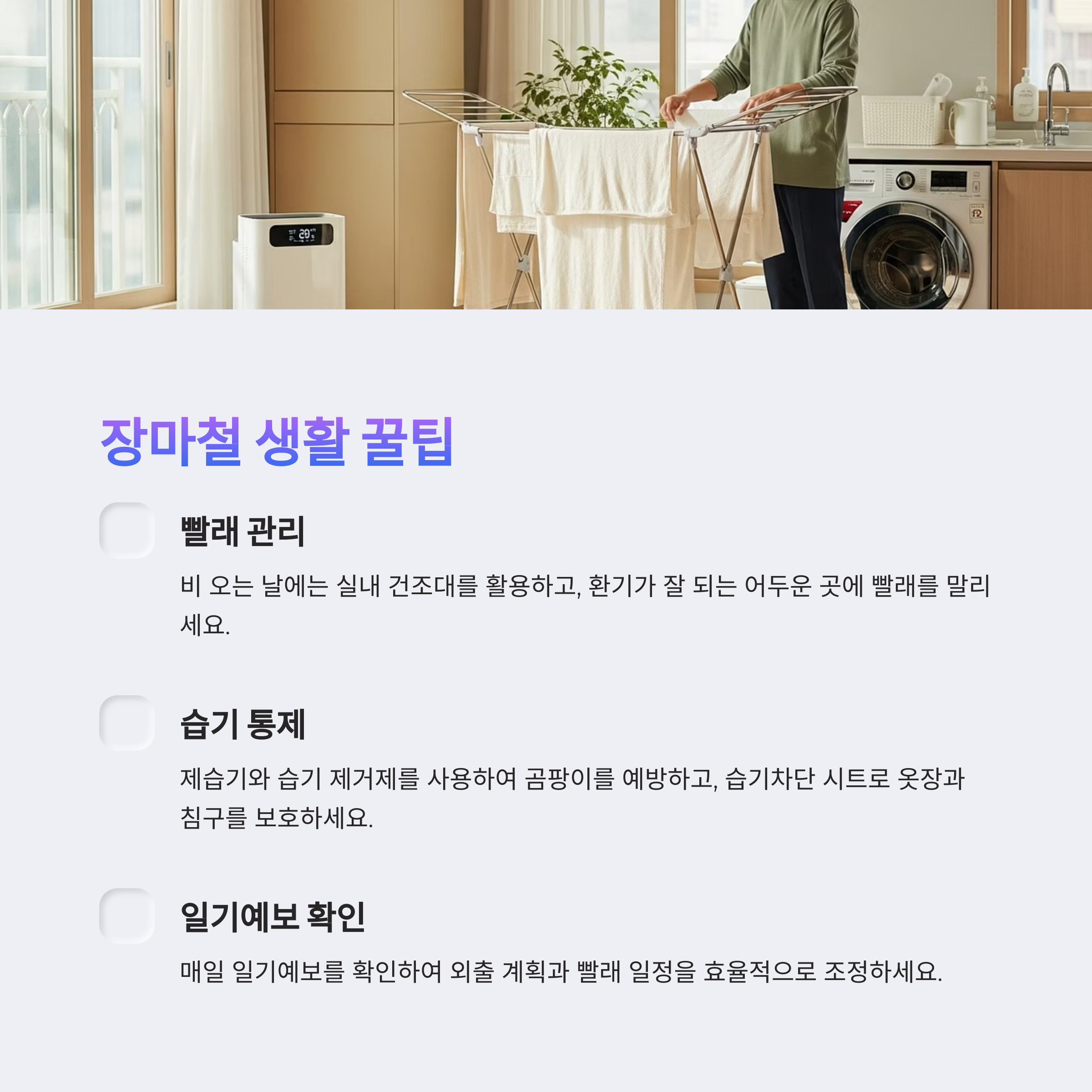 💡 TIP: 장마철엔 집안 구석구석 습기/곰팡이 방지 제품을 미리 준비하세요. 세탁은 오전에, 주기적 환기!