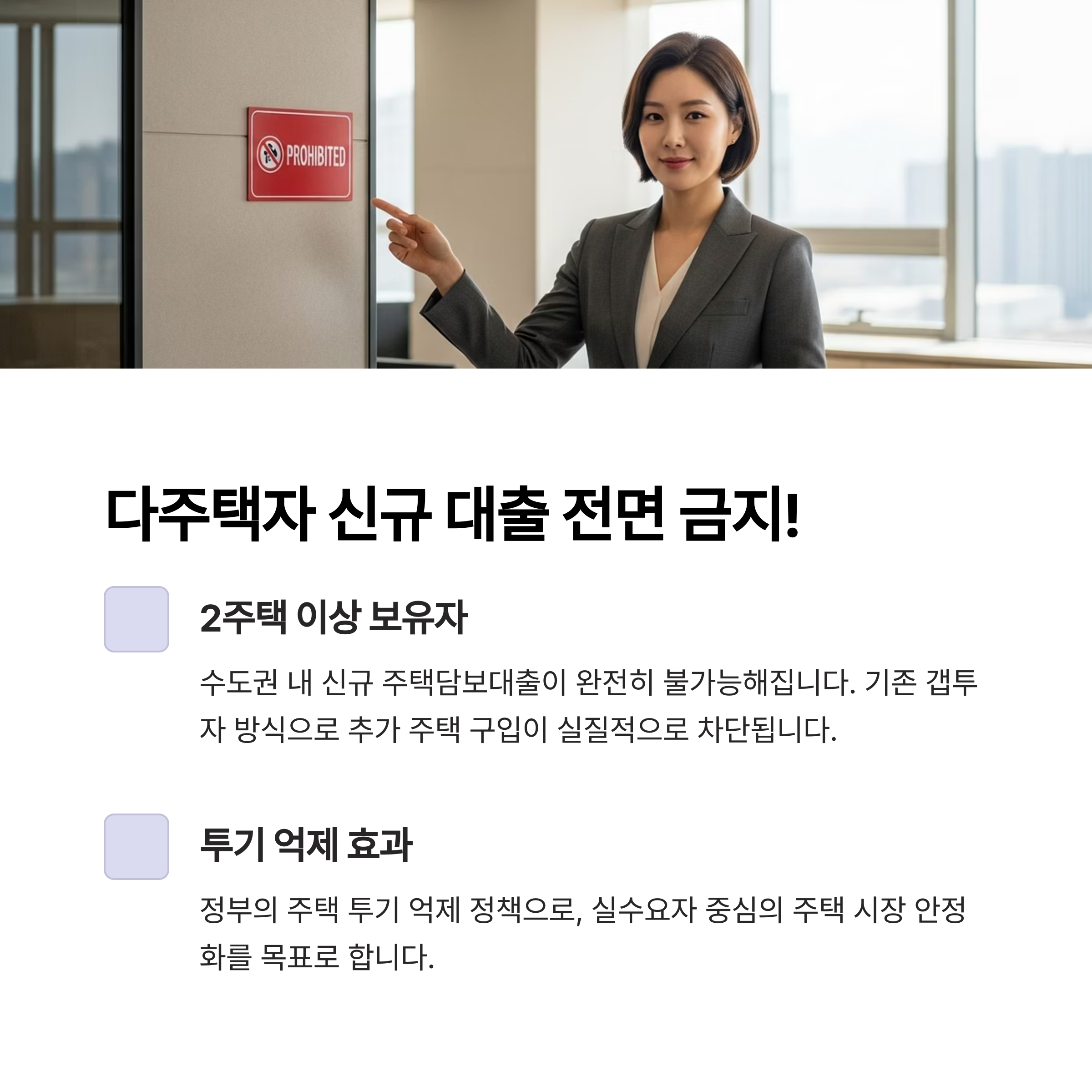 이제 2주택 이상 보유자는 수도권·규제지역 내 신규 주담대가 전면 금지됩니다.