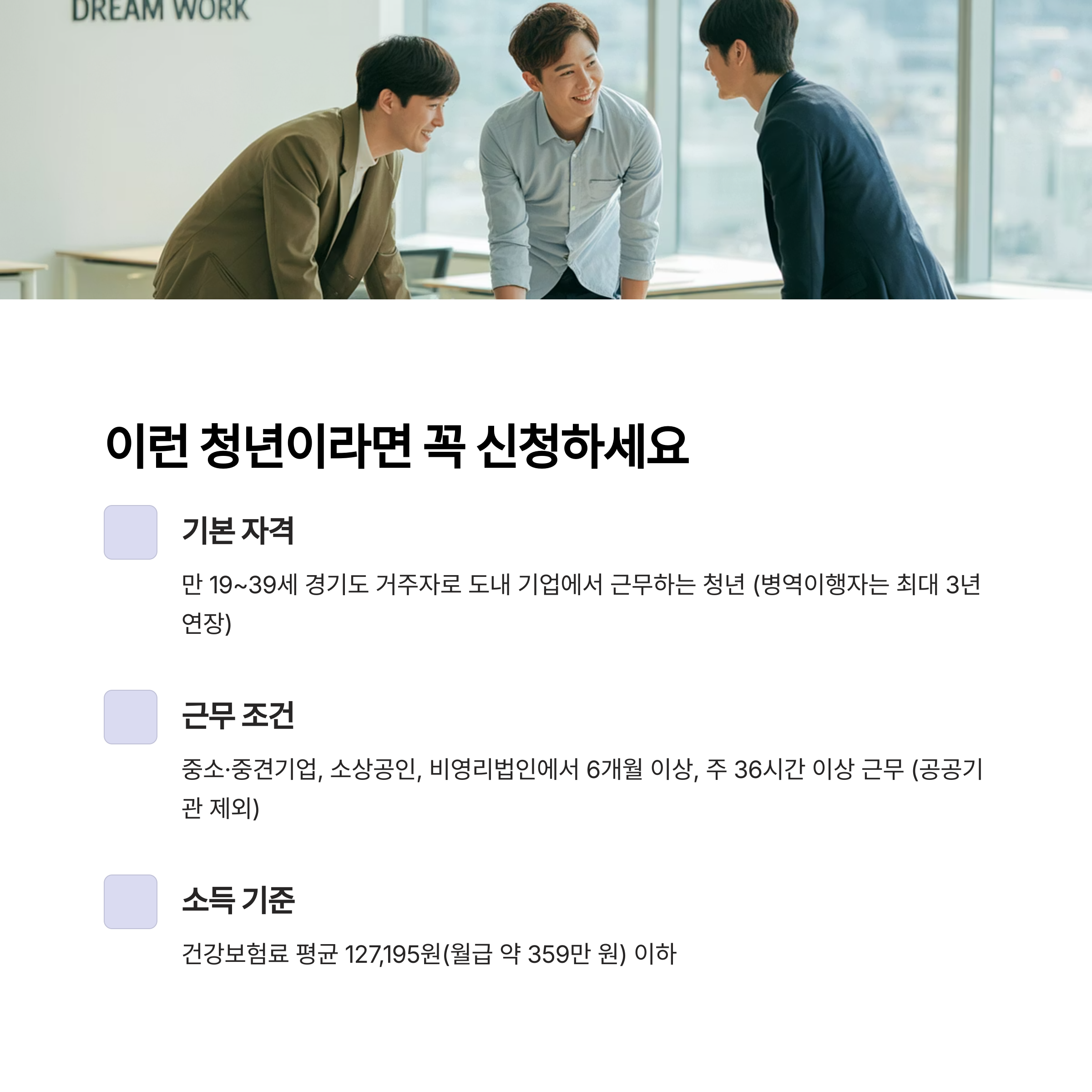 | 근무조건 | 경기도 소재 중소·중견기업, 소상공인, 비영리법인 재직자 (주 36시간 이상, 6개월 이상 근무) |