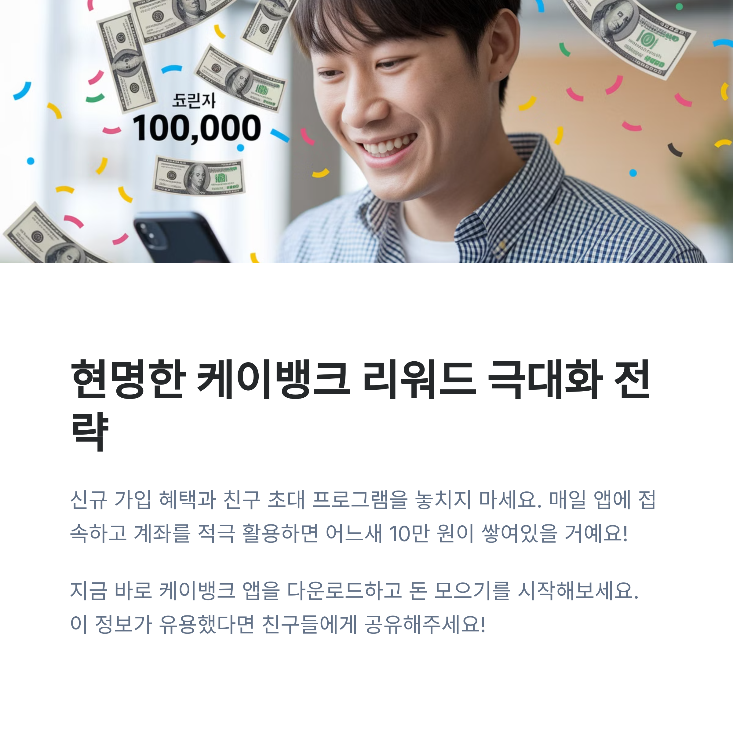 케이뱅크의 10만 원 리워드, 막연한 꿈처럼 느껴지셨나요? 하지만 매일 출석 체크하고 소소하게 리워드 카드 챙기다 보면 어느새 쌓이는 그 기쁨, 의외로 큽니다. 물론 현실적인 한계는 있지만, 재미 삼아 시작해보면 어떨까요? 꾸준함이 곧 현금이 되는 시대! 혹시 여러분도 이미 해보셨거나 꿀팁 있으시면 댓글로 함께 공유해요. 다 같이 부자 되자구요 💸