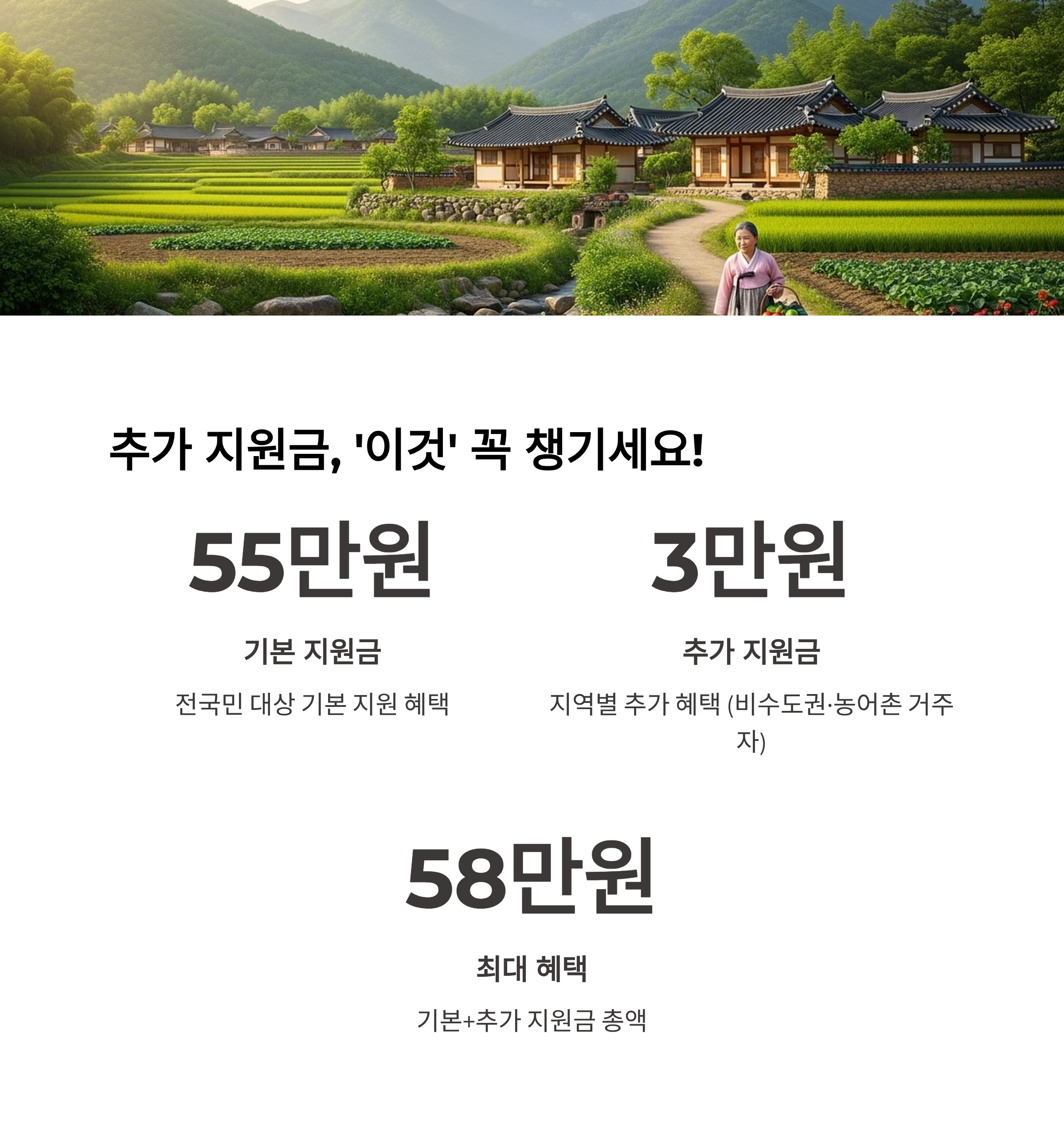 인구감소지역 및 비수도권 거주자에 한해 기본 지원금 외에 최대 3~5만원의 추가 혜택이 제공되며, 지자체별 공고문을 통해 신청 자격을 확인하세요.
