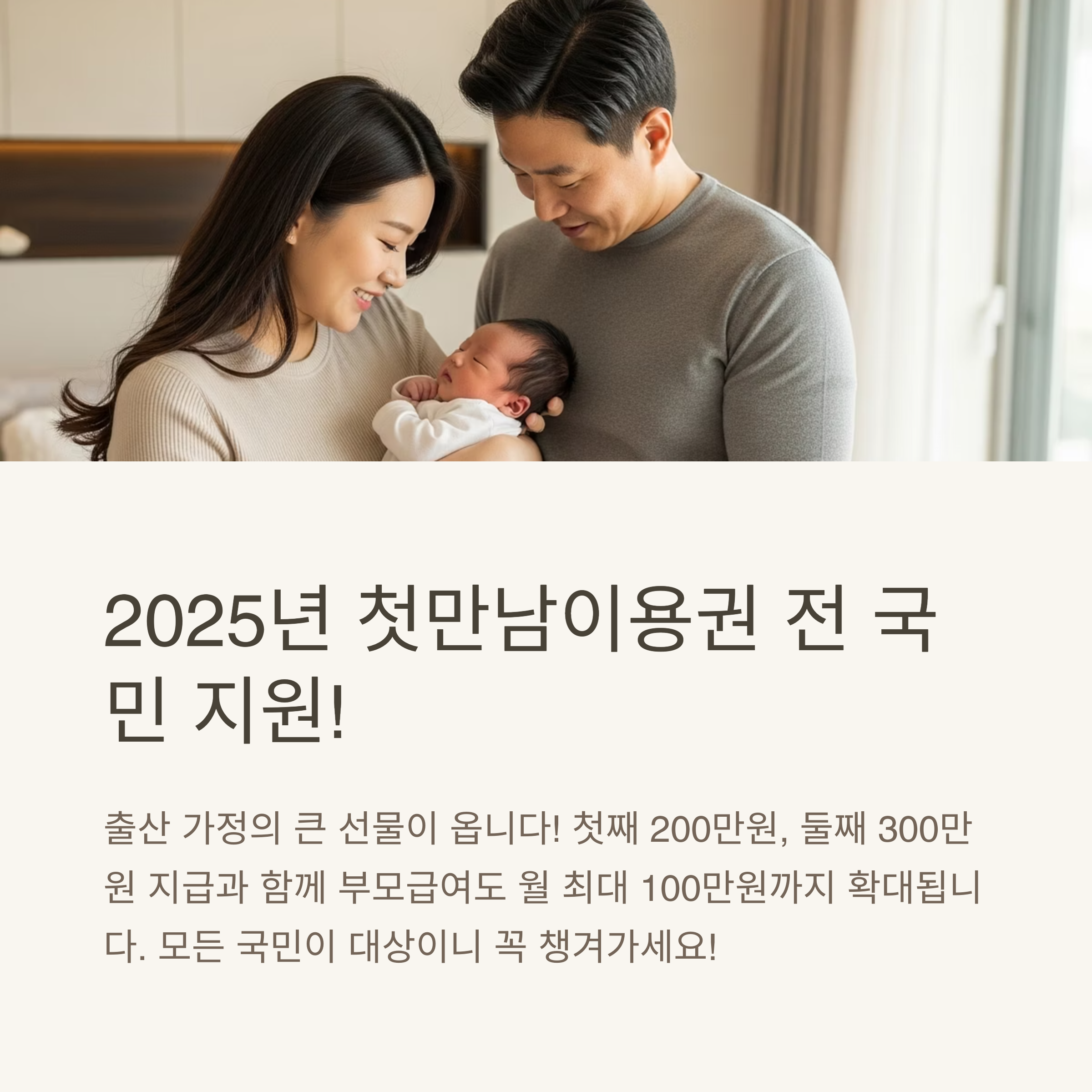 첫만남이용권은 2024년 이후 출생 아동 모두에게 200만원(첫째 기준)~300만원(둘째+)이 일시 지급되며, 부모급여는 2025년부터 월 최대 100만원까지 확대됩니다.