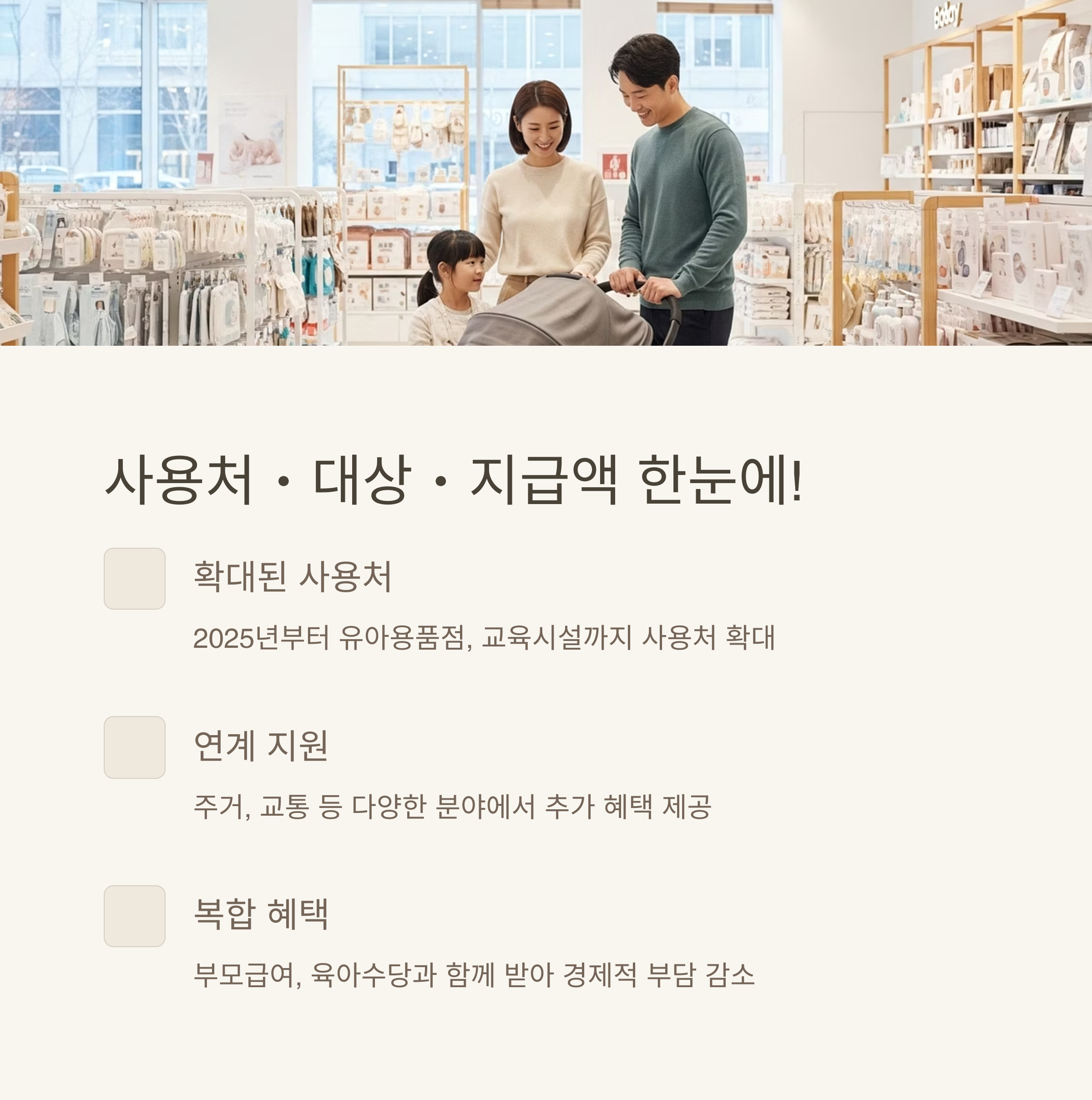 사용처: 유아용품점, 의료기관, 교육시설 등(2025년부터 확대)
