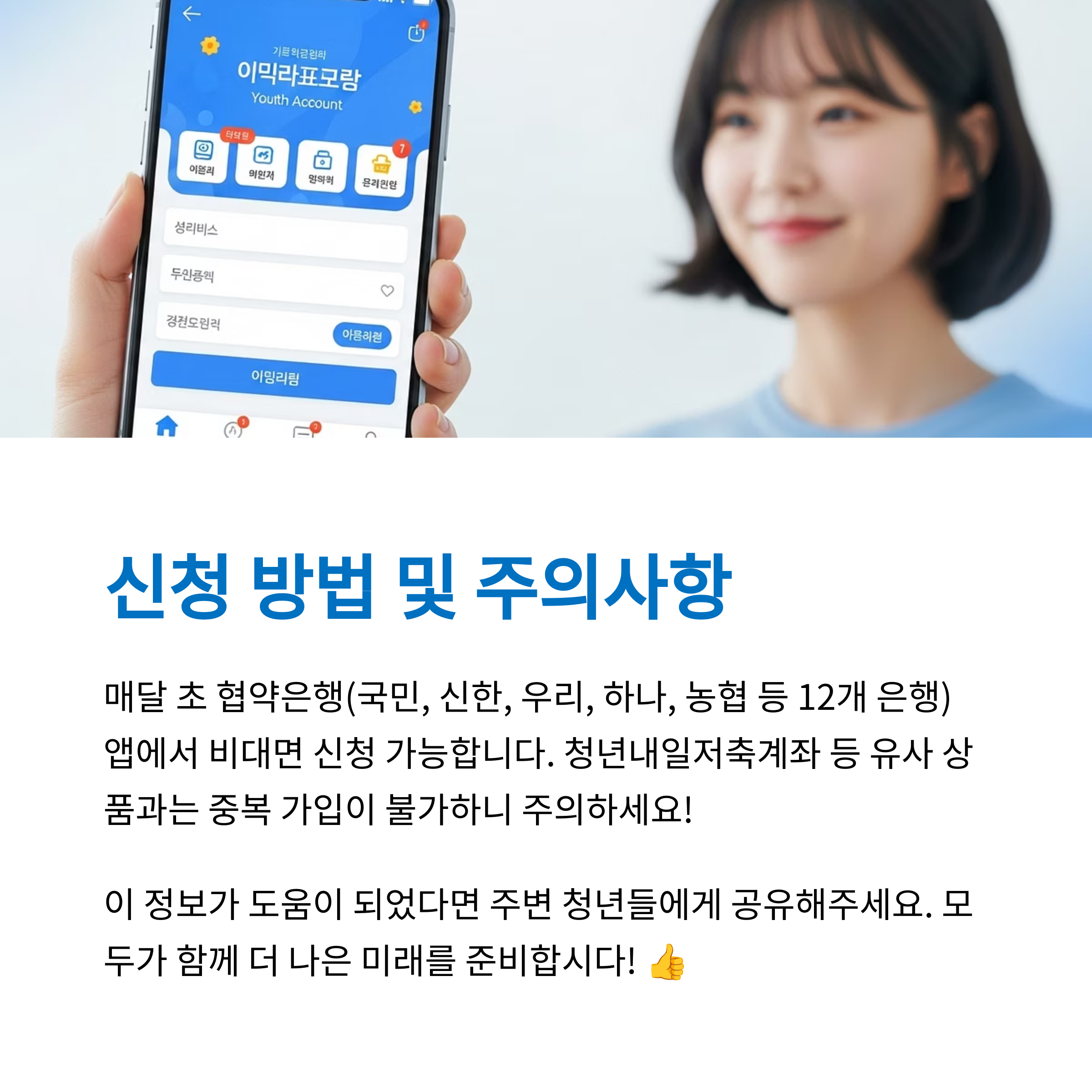 유사 자산형성상품 | 청년내일저축계좌, 청년희망적금 등과 중복 가입 불가(만기 후 가능) |
