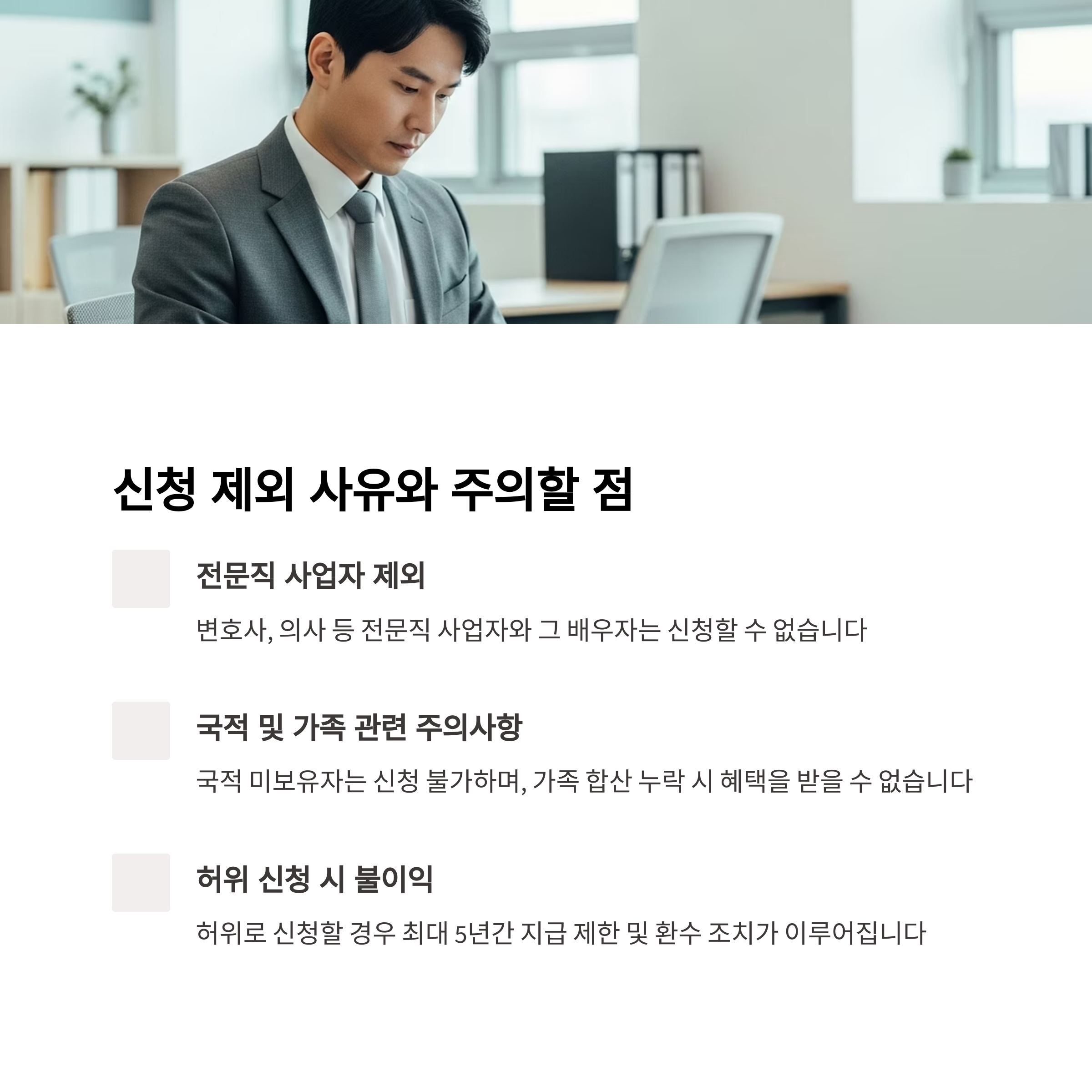 단, "기준만 맞으면 무조건 지급"은 오해입니다. 신청 제외 사유(전문직, 국적, 허위 등)는 반드시 확인해야 합니다.