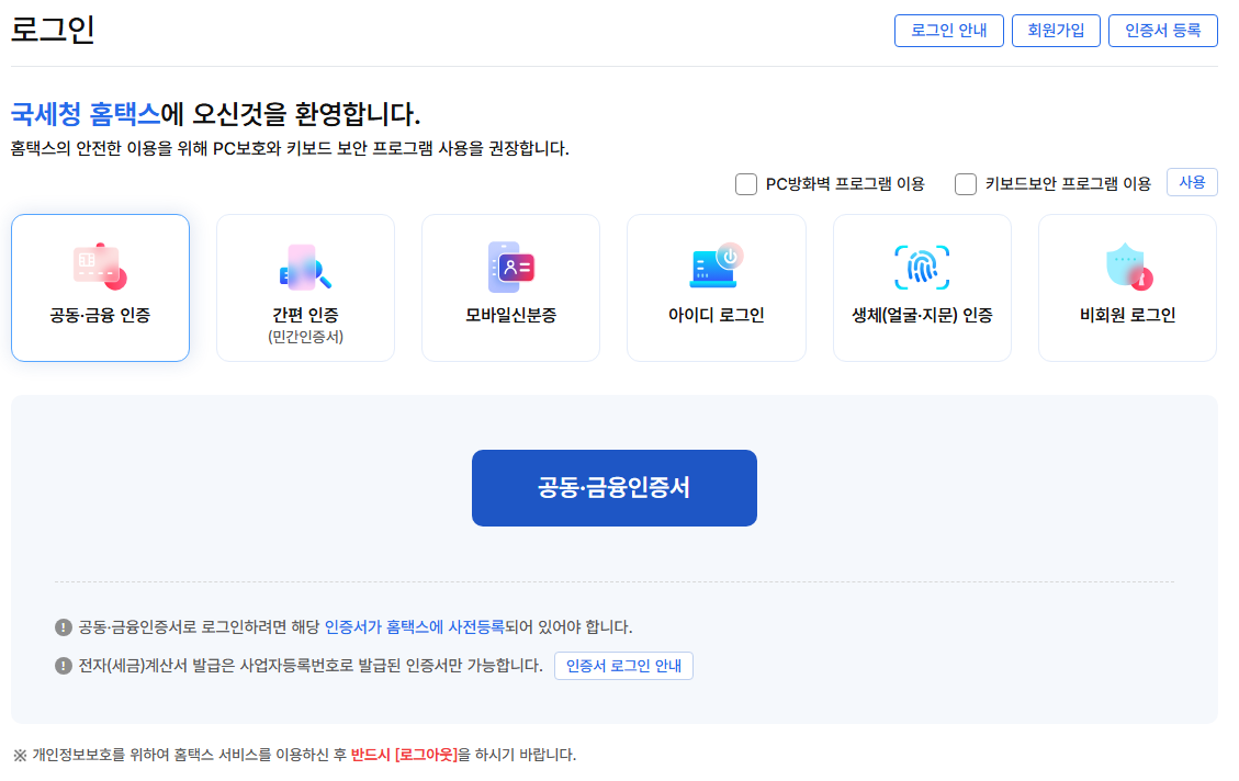 | 인증 절차 | 공동인증서 또는 간편인증 이용 |