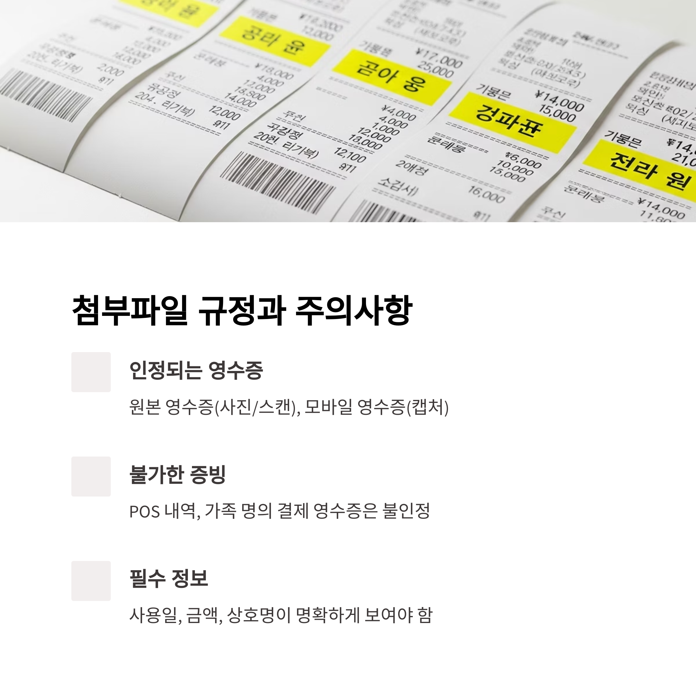 ⚠️ 주의: POS 내역은 인정되지 않습니다. 또한, 가족 명의로 결제된 영수증은 청구 불가하니 반드시 본인 명의 영수증을 첨부해야 합니다.