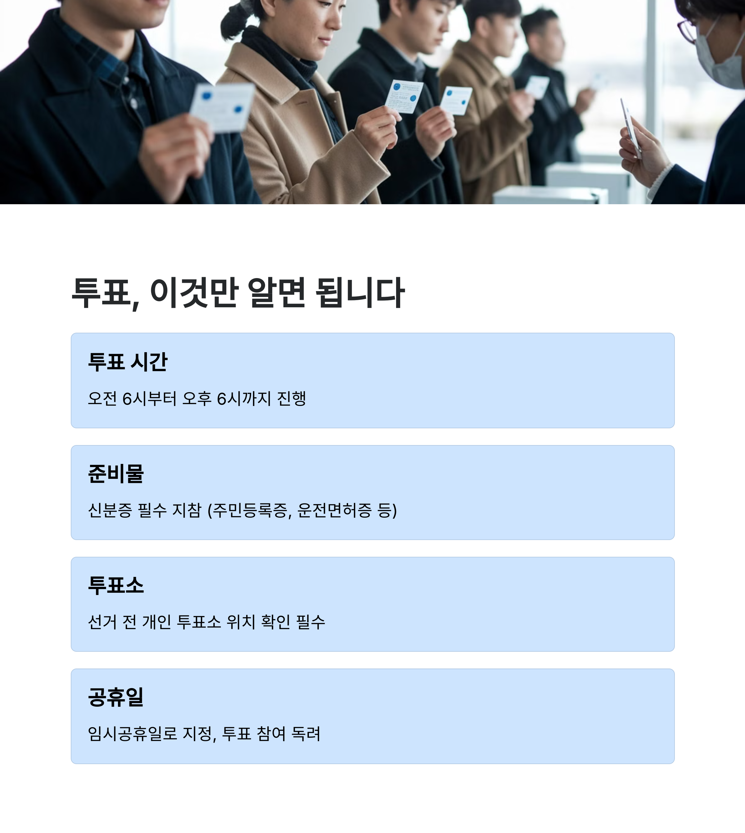 - 📍 투표소 확인: 중앙선관위 홈페이지 또는 포털에서 ‘내 투표소’ 검색