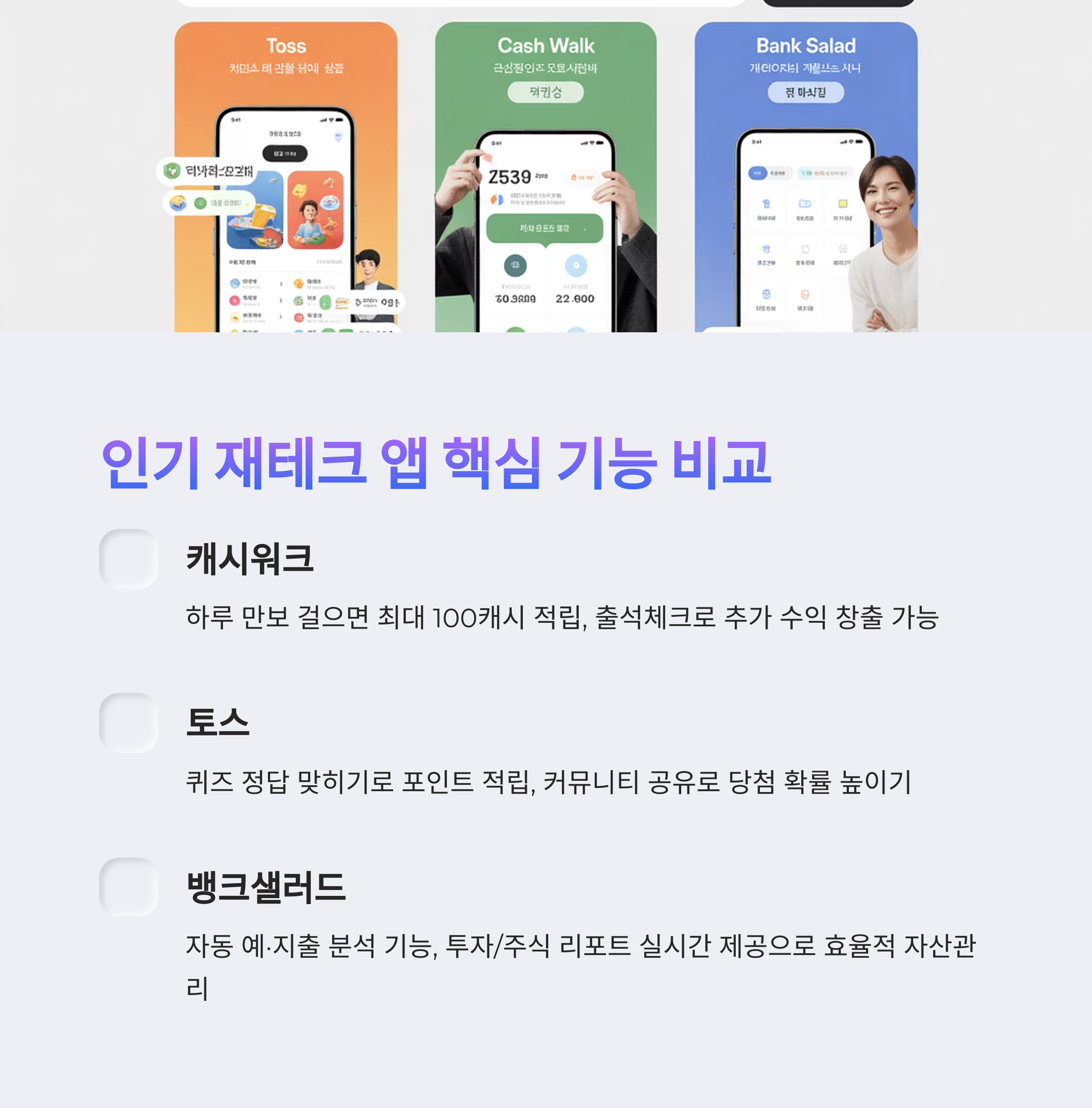 걷기·퀴즈 등 미션형 앱은 꾸준함이, 투자/예산 관리 앱은 데이터 연동과 분석 기능이 핵심이에요.