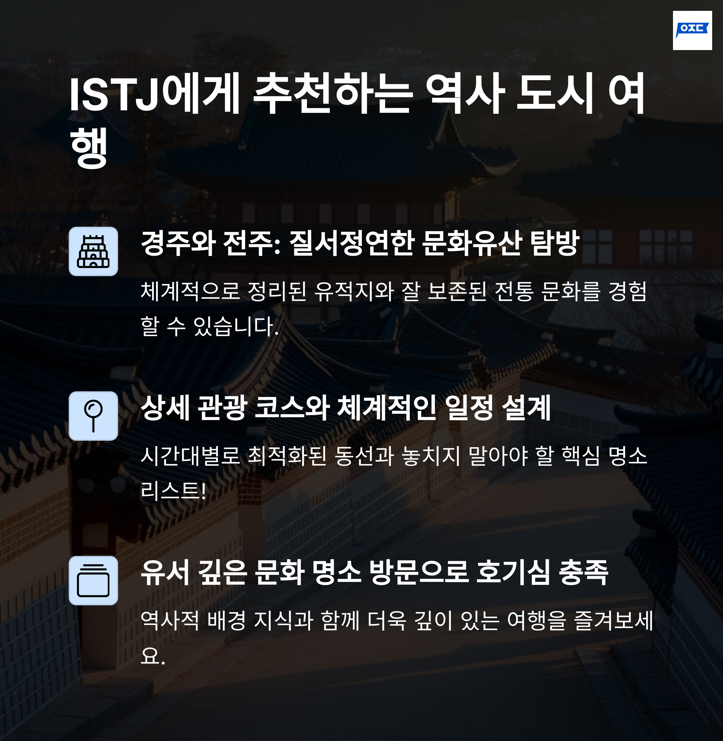 여행이라는 건, 결국 나를 다시 만나러 가는 여정 같아요. ISTJ 성향처럼 계획적으로 움직이면서도 그 안에서 여유를 느끼는 법, 우리가 함께 찾아보면 어떨까요? 경주, 전주, 지리산, 그리고 반려동물과 함께하는 순간들까지—모두 당신의 취향을 반영한 여행이 되길 바라요. 혹시 다른 MBTI 유형에 맞춘 여행이 궁금하다면, 댓글로 이야기 나눠봐요. 여러분의 이야기도 정말 듣고 싶거든요!